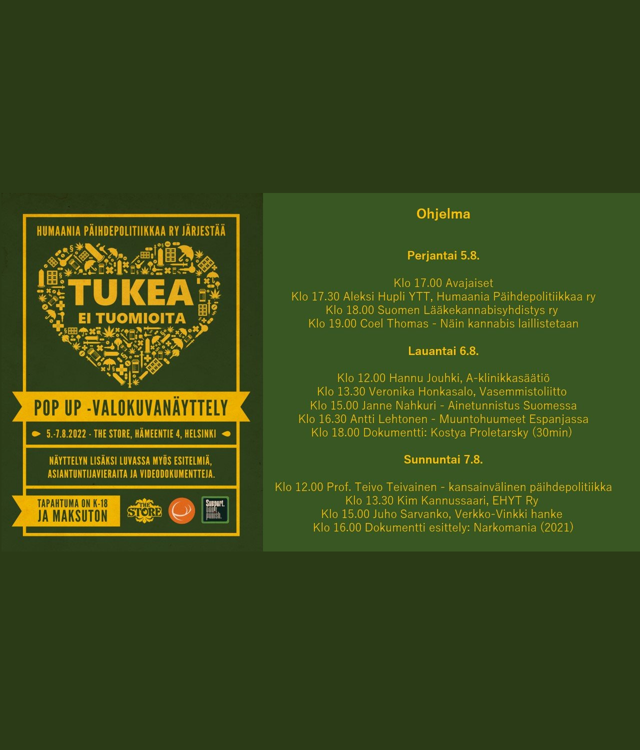 Järjestimme osana kansainvälistä Support. Don´t Punish eli Tukea Ei Tuomioita -kampanjaa tapahtuman 5.–7. elokuuta 2022 Helsingin Hakaniemessä The Store -liikkeessä. Kyseessä oli viikonlopun kestänyt pop up -valokuvanäyttely sekä puhujatapahtuma, jossa nähtiin myös huumausainepolitiikkaa käsitteleviä dokumentteja.