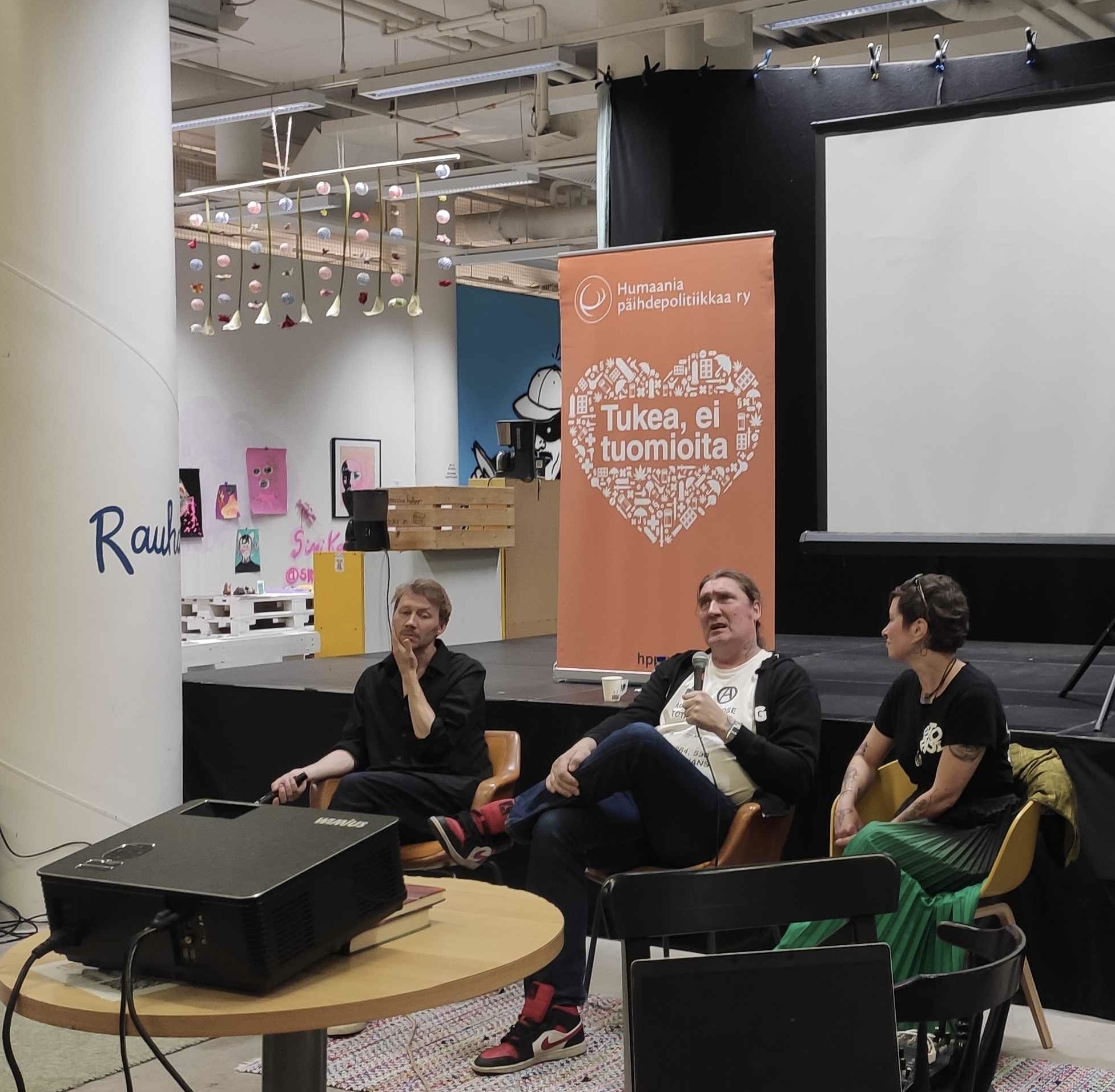 Tilaisuuden lopuksi dokumentista, yliannostuskuolemista ja Suomen huumetilanteesta keskusteltiin yhdessä Mytty Messmer-Koskisen, J-P Pääskysaaren ja Timo Pasasen kanssa.